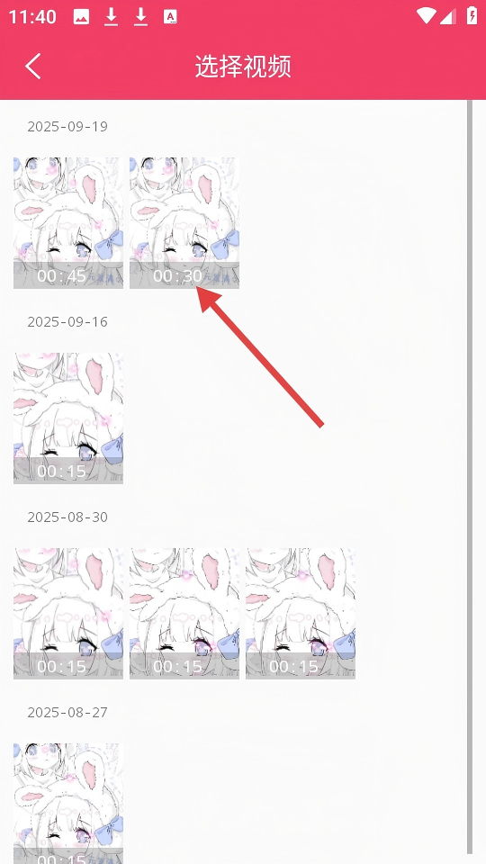 2、在【選擇視頻】頁面,點(diǎn)擊想要倒放的視頻縮略圖即可選中。