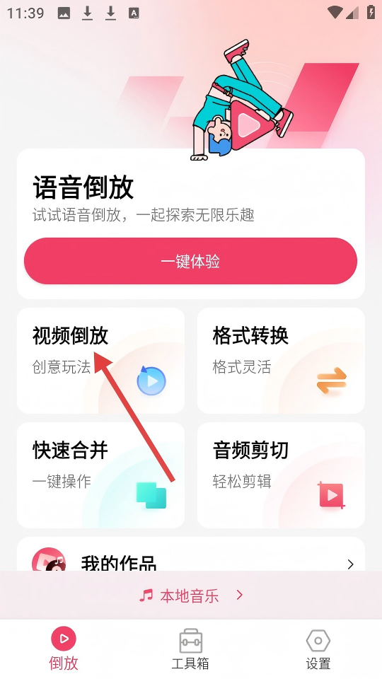 1、進(jìn)入應(yīng)用后,在【倒放】頁面點(diǎn)擊【視頻倒放】可開啟創(chuàng)意玩法。