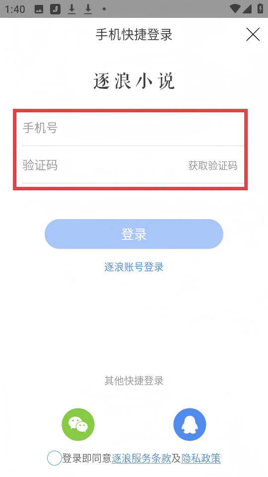 4、打開逐浪小說后,在【手機(jī)快捷登錄】界面輸入【手機(jī)號(hào)】,獲取并填寫【驗(yàn)證碼】,即可登錄。