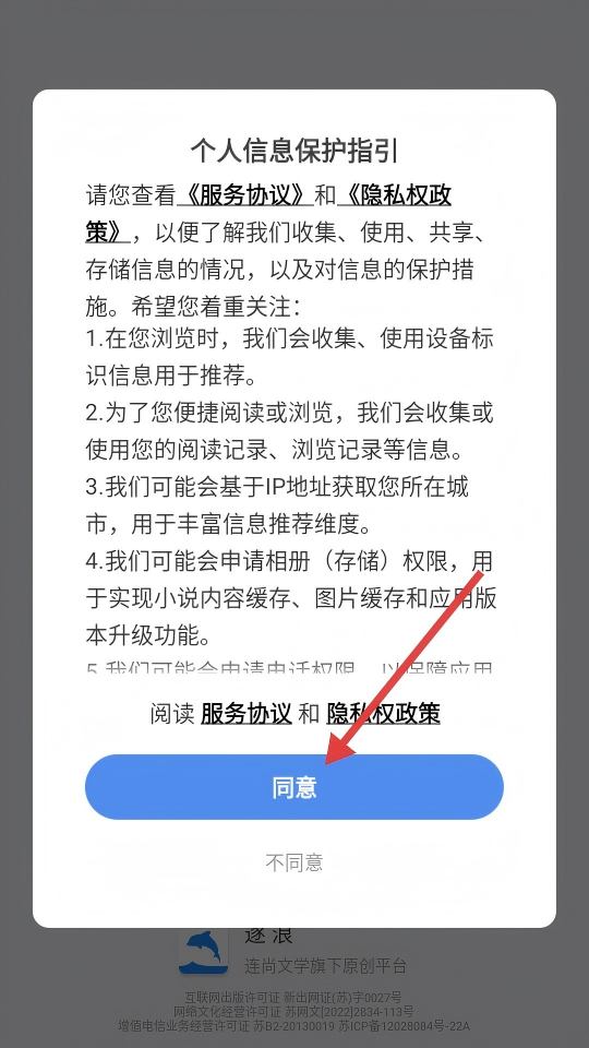 1、在逐浪小說的【個(gè)人信息保護(hù)指引】界面,閱讀后點(diǎn)擊【同意】,即可繼續(xù)使用應(yīng)用。