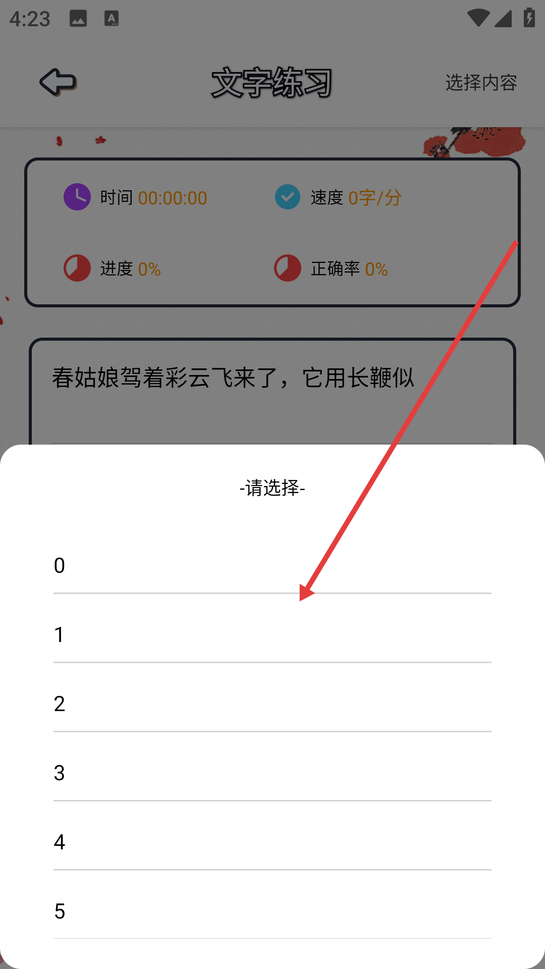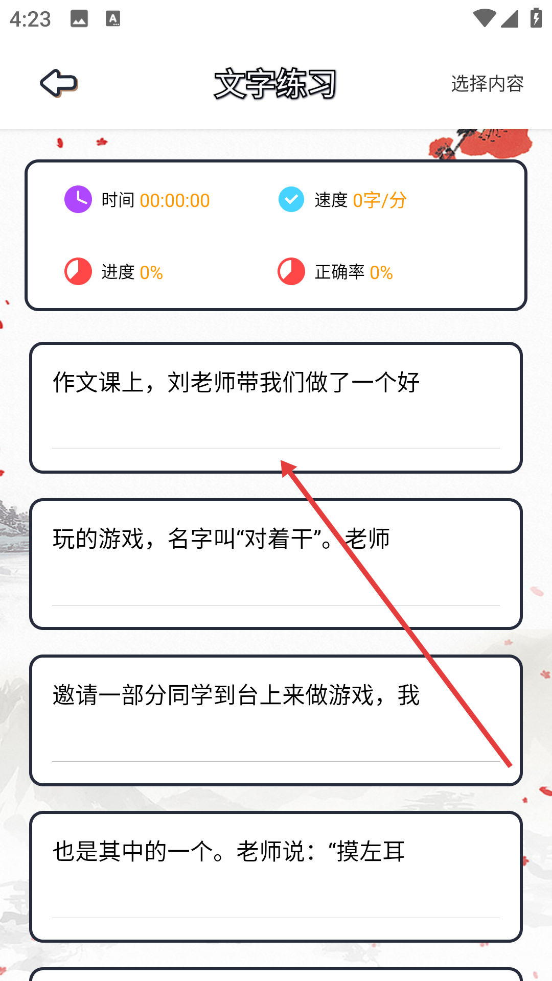 3、在選擇內容界面選擇所需序號,進入文字練習界面。