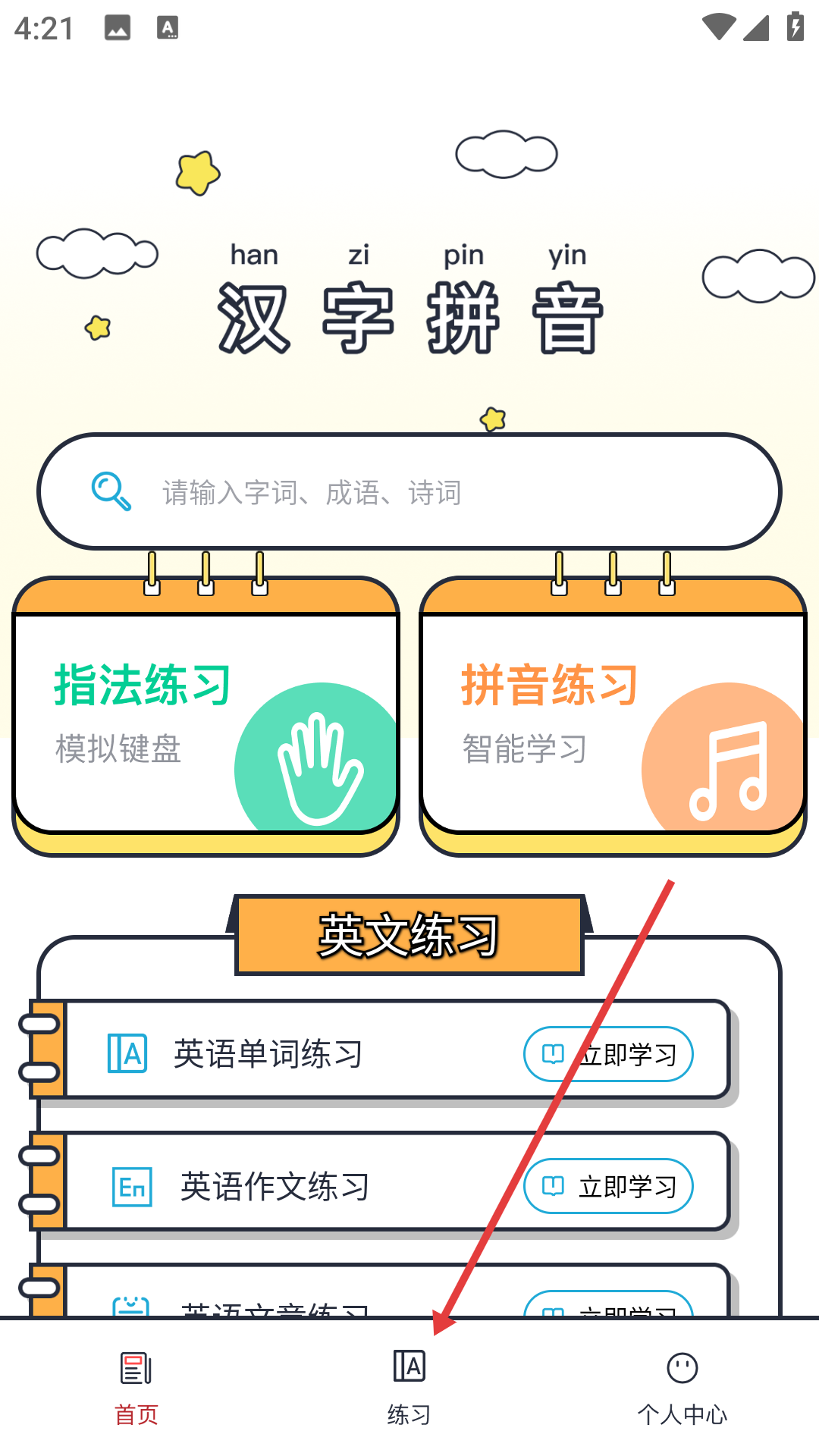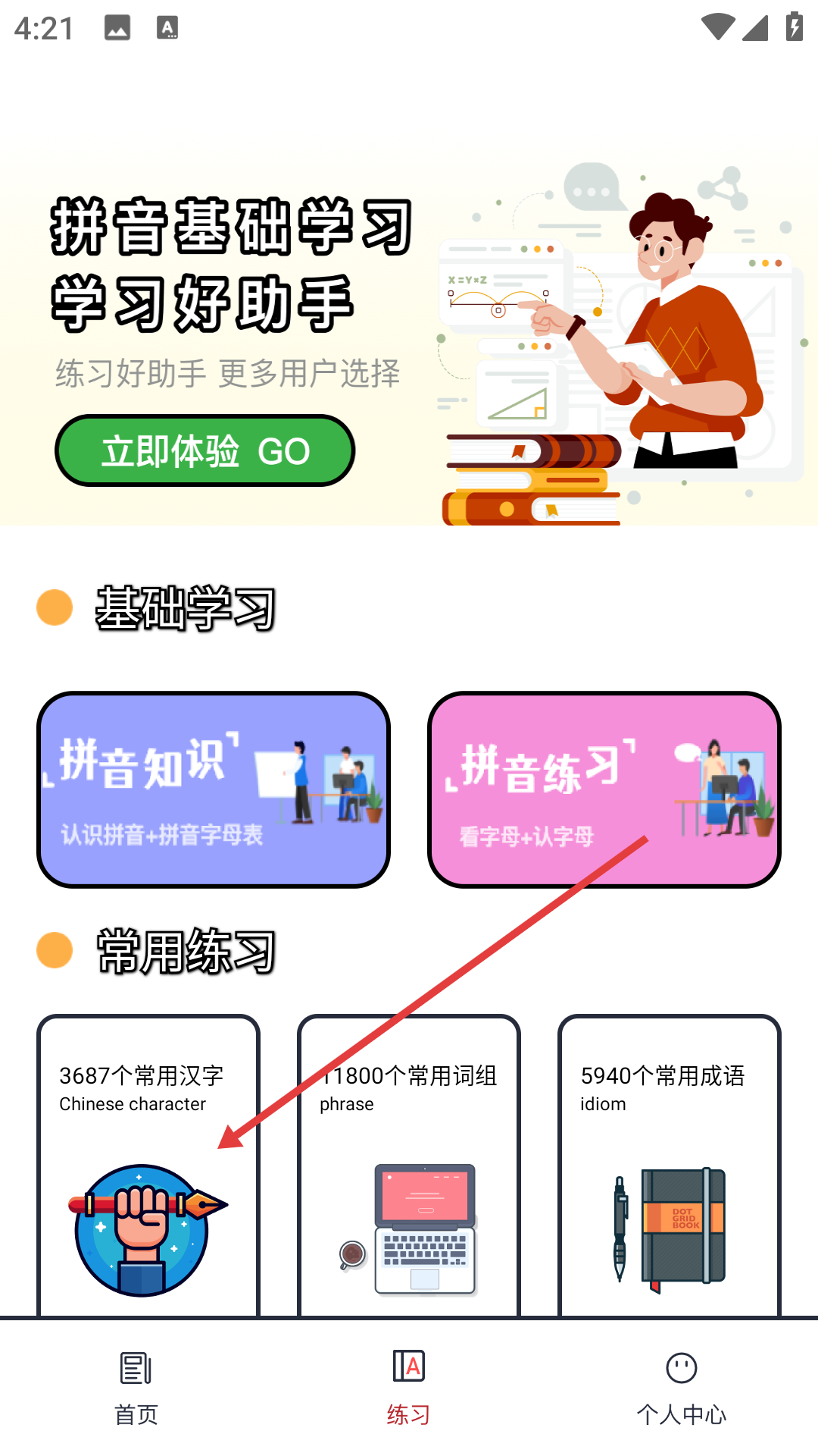 1、點擊底部【練習】,進入練習頁面,可查看拼音基礎學習、基礎學習、常用練習等板塊。