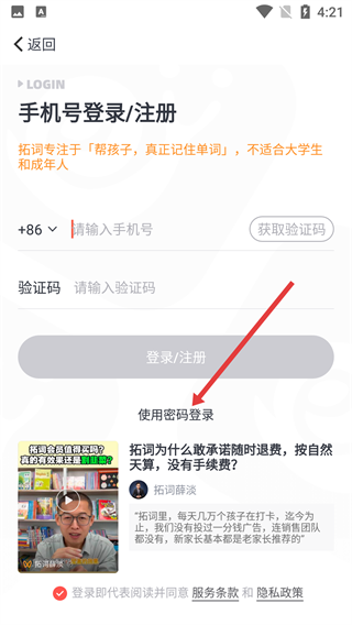 3、在手機號登錄/注冊頁面,可點擊【使用密碼登錄】,切換登錄方式。