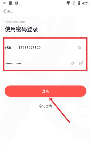 4、在使用密碼登錄頁面,輸入手機號和密碼后,點擊【登錄】按鈕,完成登錄操作。