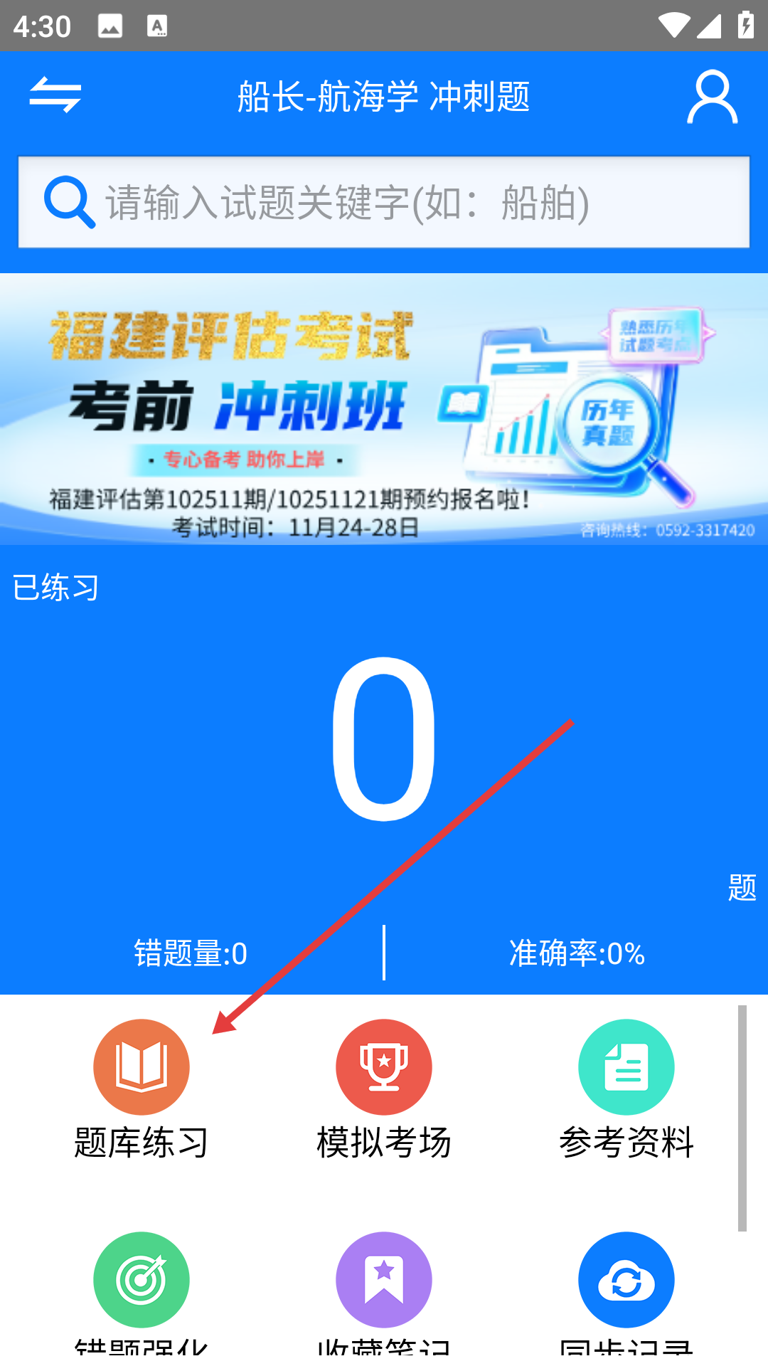 1、點(diǎn)擊【題庫練習(xí)】,進(jìn)入題庫練習(xí)頁面,可查看“船長航海學(xué)-沖刺題”等各類題目列表。
