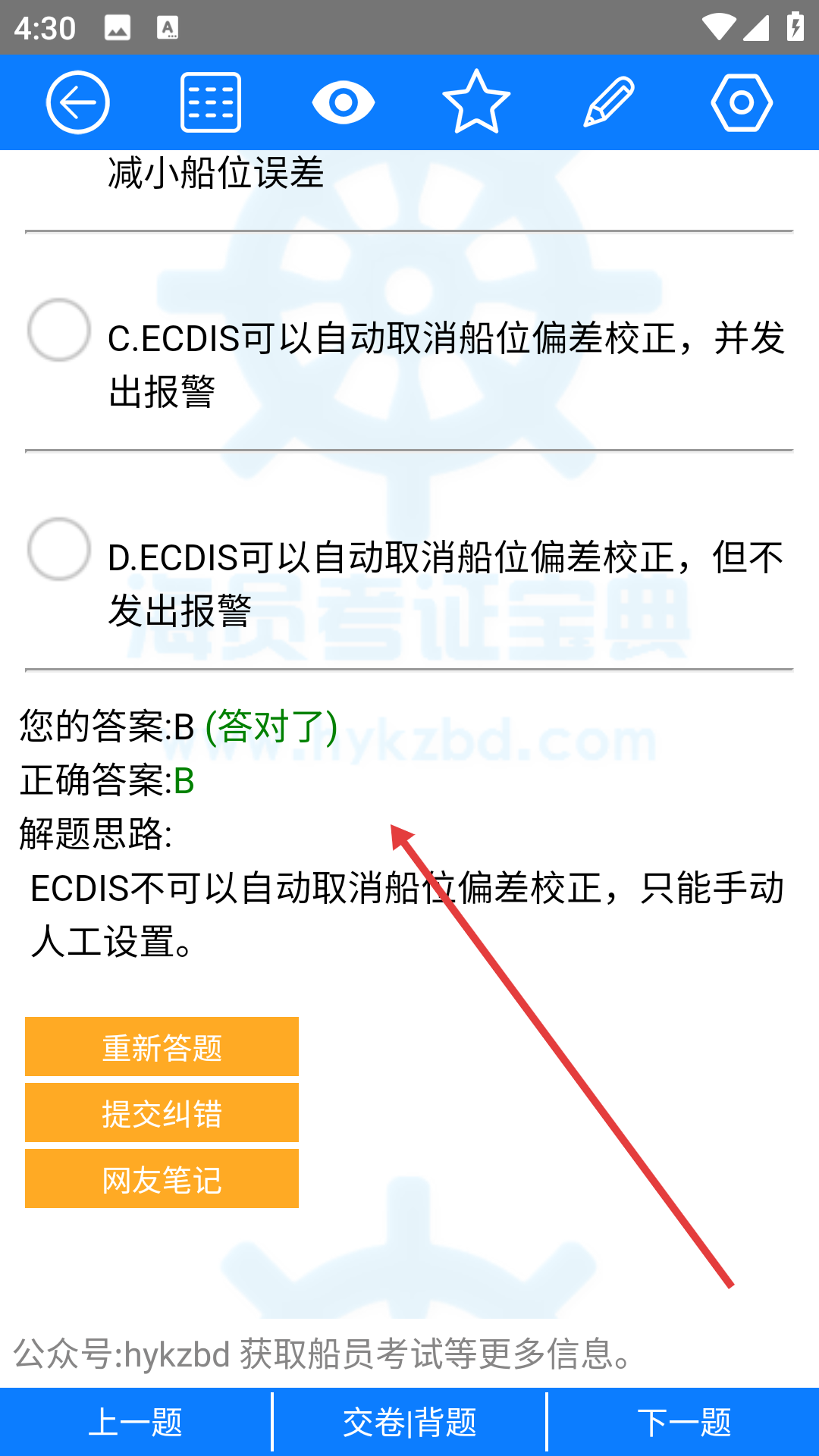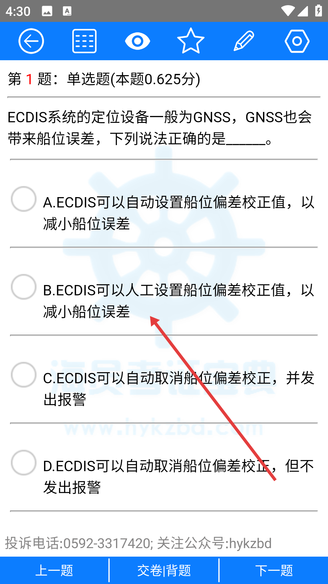 3、在題目練習(xí)界面,針對(duì)單選題(如ECDIS系統(tǒng)船位誤差相關(guān)題目),選擇正確選項(xiàng)(如B選項(xiàng))。