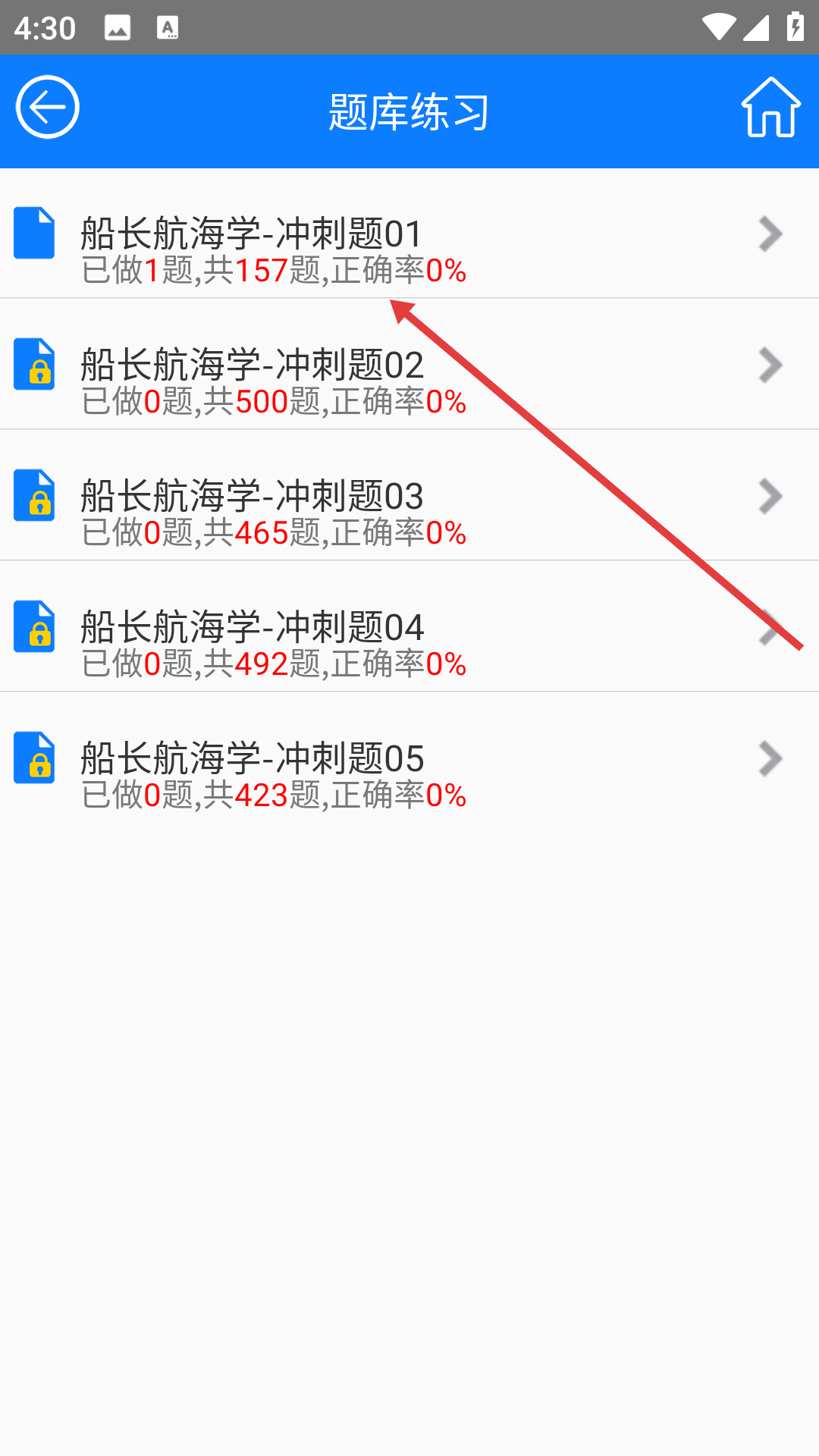 2、在題庫練習(xí)頁面選擇“船長航海學(xué)-沖刺題01”,進(jìn)入具體題目練習(xí)界面。