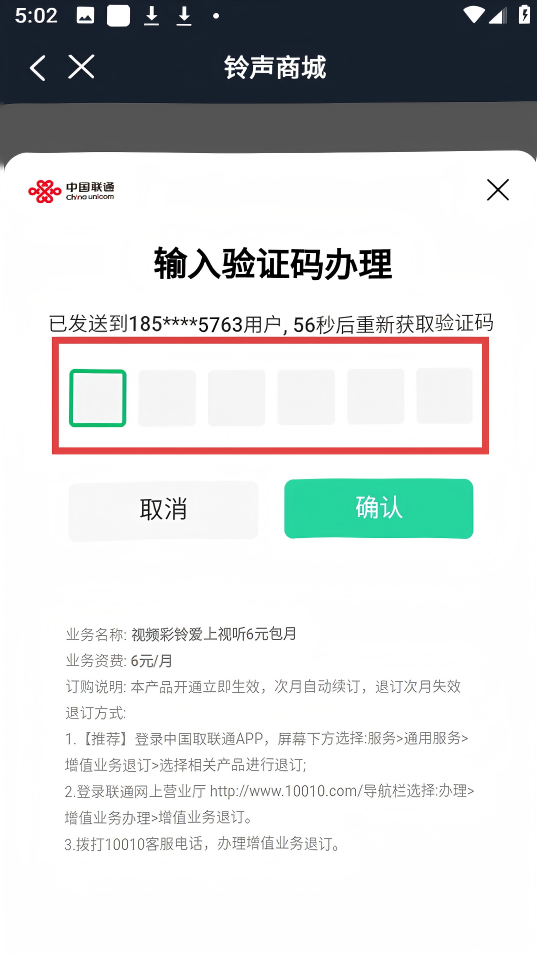 4、在輸入驗(yàn)證碼辦理界面,輸入發(fā)送到指定號(hào)碼的驗(yàn)證碼后點(diǎn)擊【確認(rèn)】即可完成業(yè)務(wù)辦理。