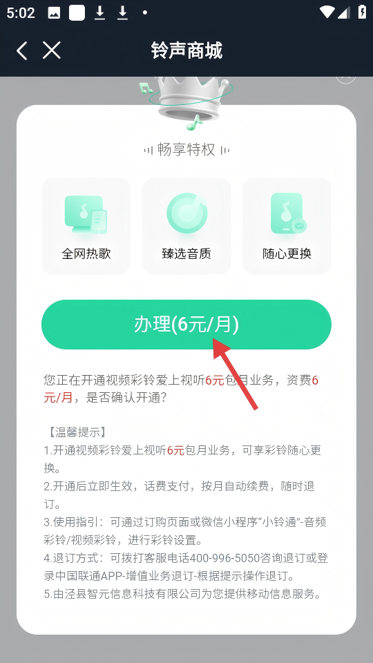 3、在業(yè)務(wù)辦理彈窗中,點(diǎn)擊【辦理(6元/月)】可開通視頻彩鈴愛上視聽6元包月業(yè)務(wù)。