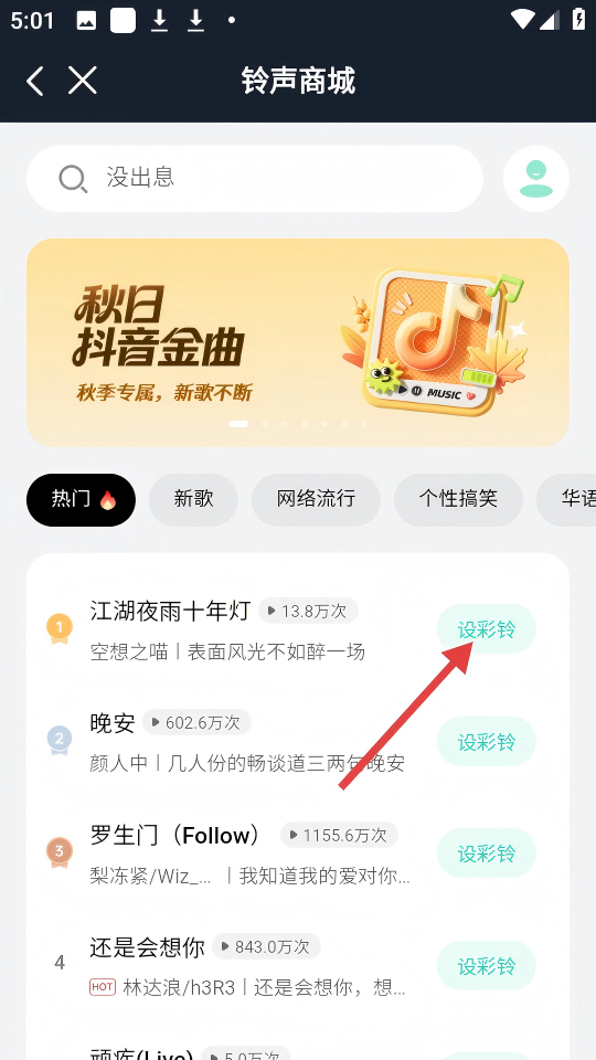 2、在鈴聲商城熱門列表中,點(diǎn)擊歌曲旁的【設(shè)彩鈴】可進(jìn)行彩鈴設(shè)置操作。