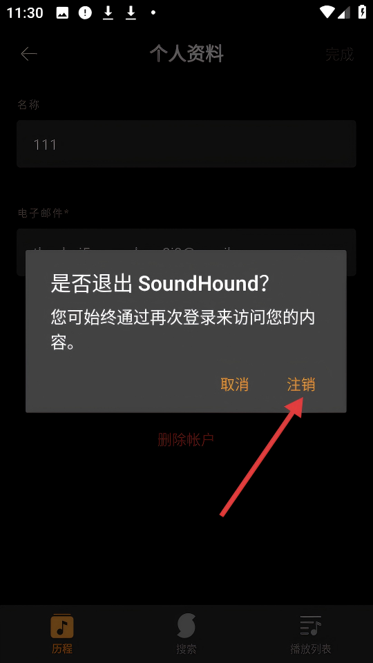 4、在【是否退出SoundHound?】確認框中點擊【注銷】,完成注銷。