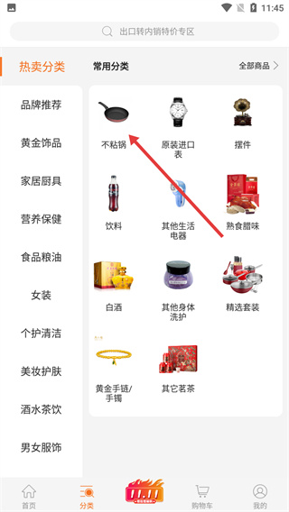 2、在商品分類頁(yè)面,找到【不粘鍋】分類并點(diǎn)擊,進(jìn)入不粘鍋商品列表頁(yè)面。
