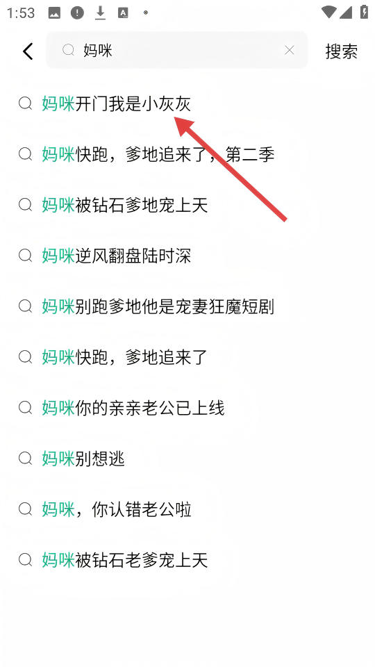 3、輸入【媽咪】后,可選擇相關(guān)聯(lián)想詞如【媽咪開門我是小灰灰】快速查找短劇。