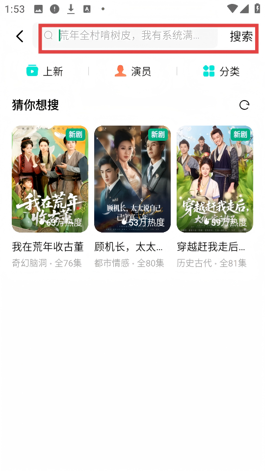 2、在搜索框輸入短劇名稱,可通過(guò)【上新】【演員】【分類】標(biāo)簽或【猜你想搜】推薦查找短劇。