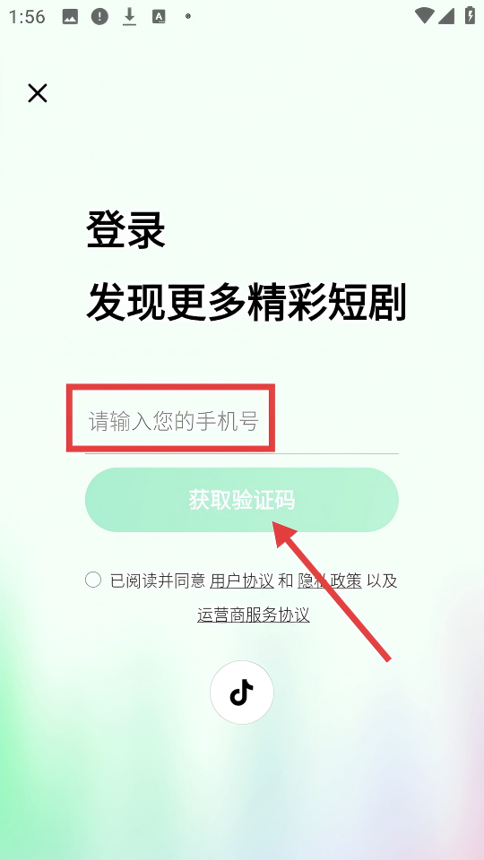 3、在登錄頁輸入手機號,勾選已閱讀協(xié)議后點擊【獲取驗證碼】。