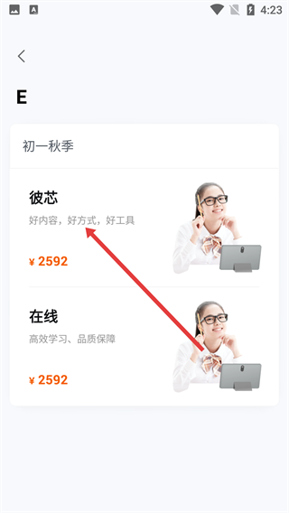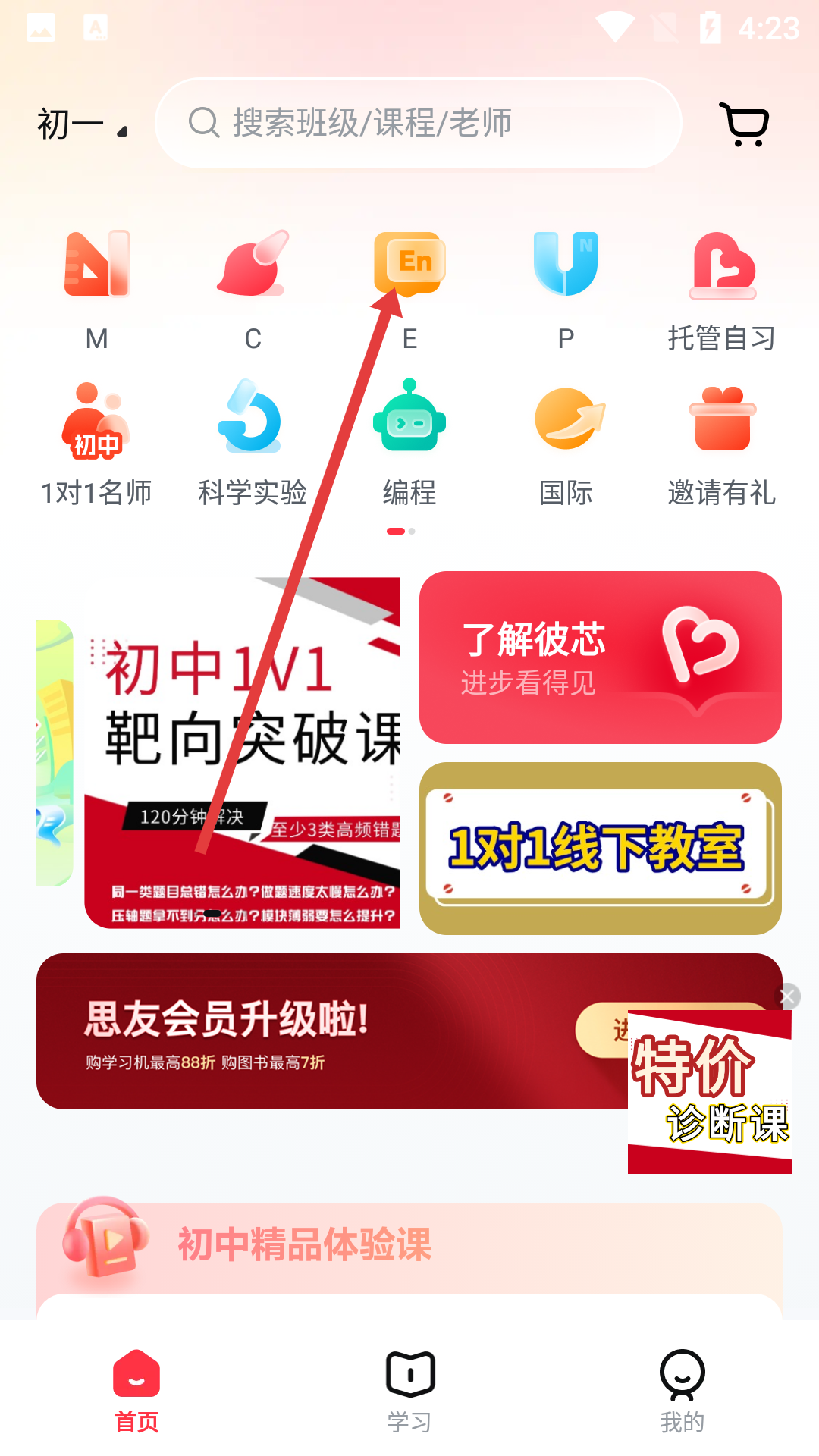 1、在首頁(yè)點(diǎn)擊標(biāo)注“En”的“E”英語(yǔ)圖標(biāo),進(jìn)入初一秋季課程選擇頁(yè)面。