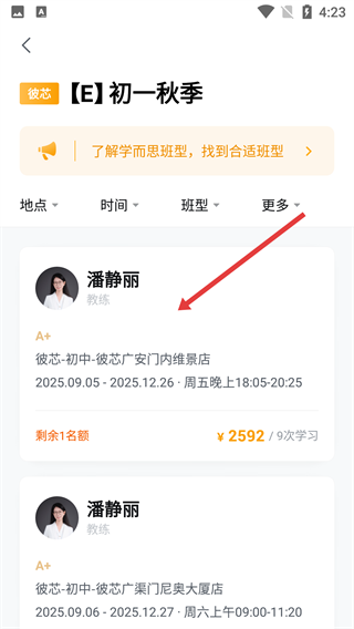 3、在班級(jí)列表頁(yè)面,選擇潘靜麗教練的彼芯廣安門內(nèi)維景店班級(jí),進(jìn)入班級(jí)詳情頁(yè)面。