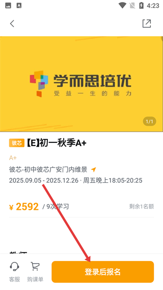 4、在班級(jí)詳情頁(yè)面,點(diǎn)擊橙色“登錄后報(bào)名”按鈕,完成課程報(bào)名操作。