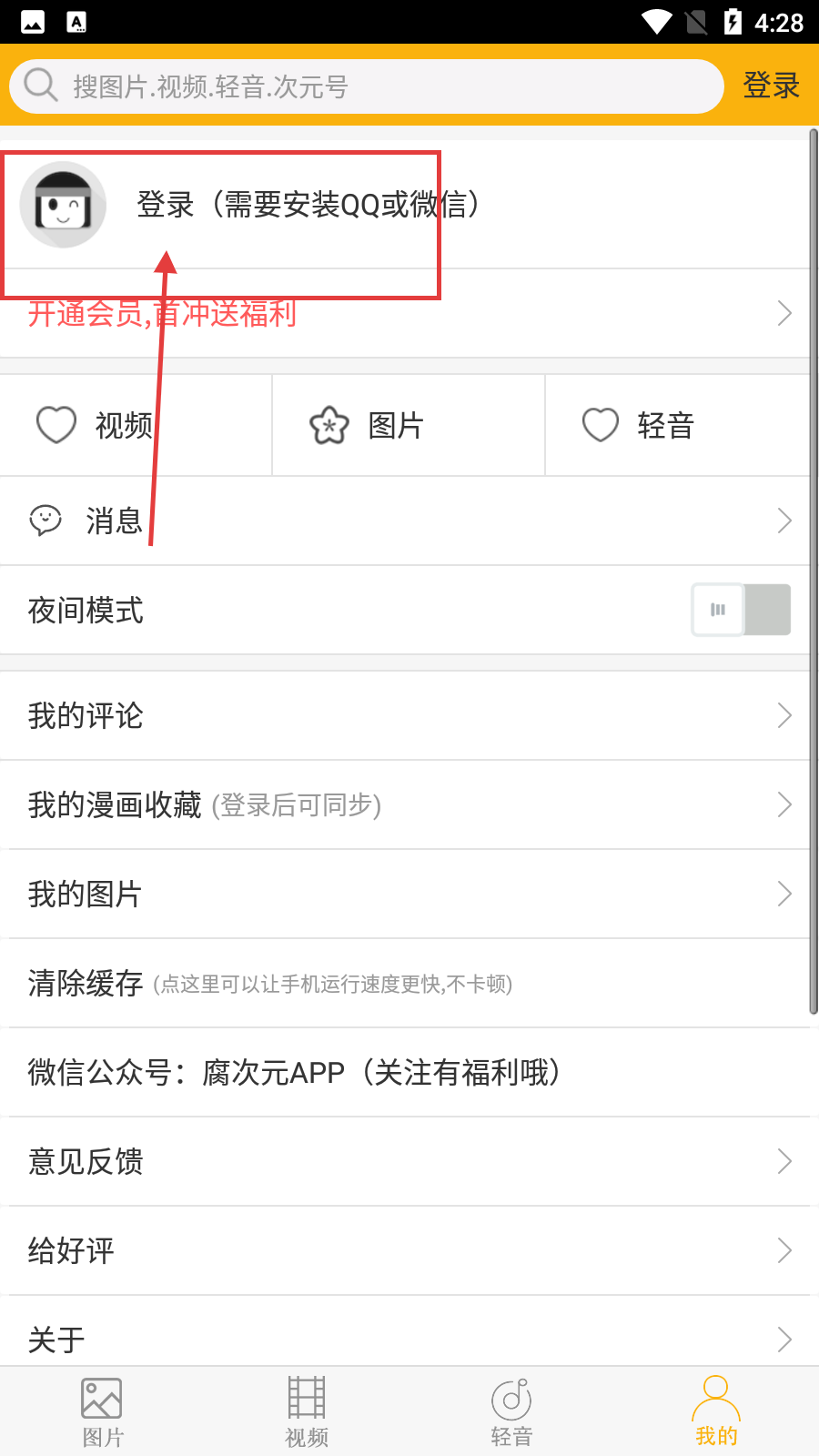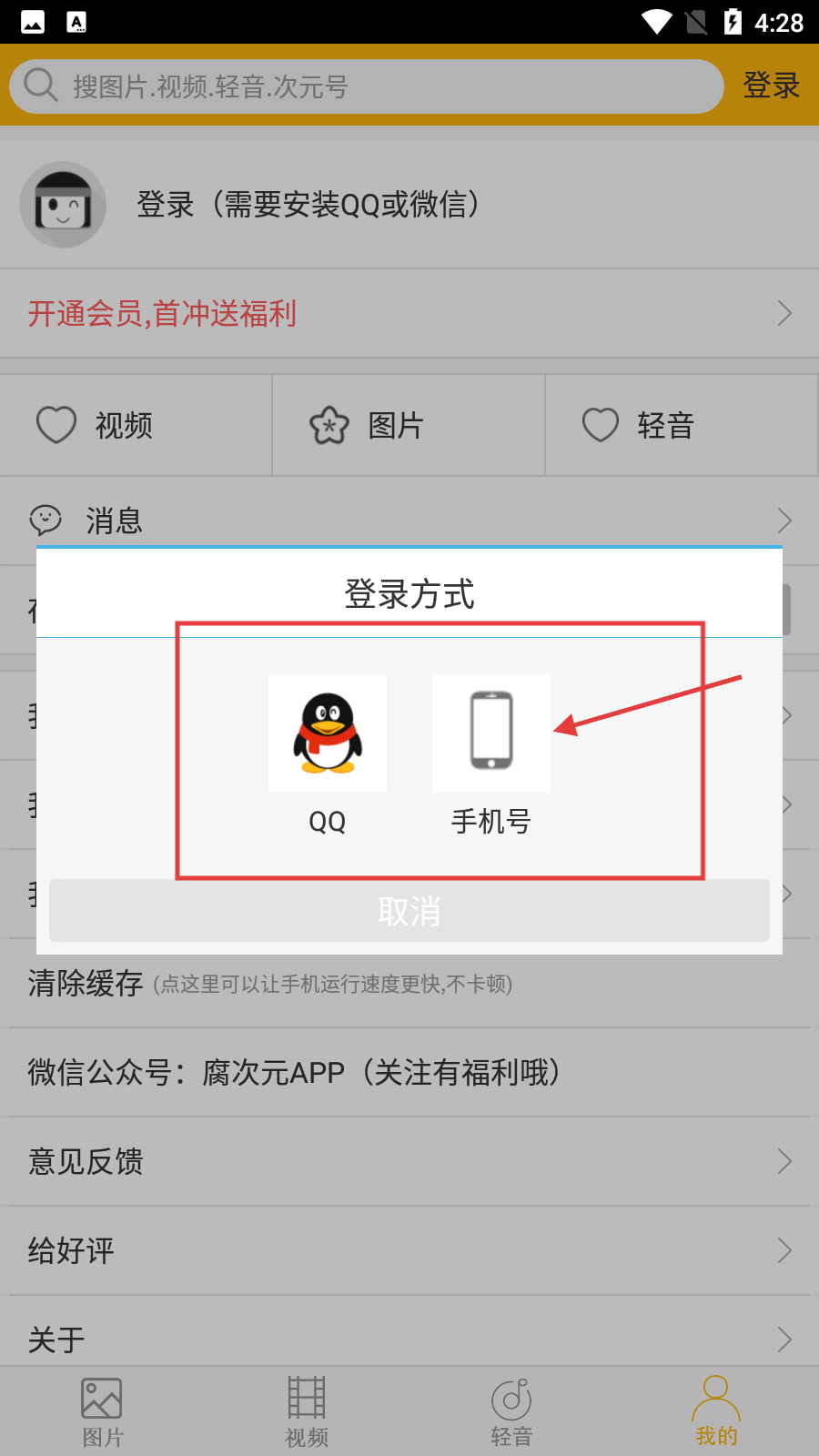 2、在個人中心頁面,點擊【登錄(需要安裝QQ或微信)】區(qū)域,彈出登錄方式選擇框。