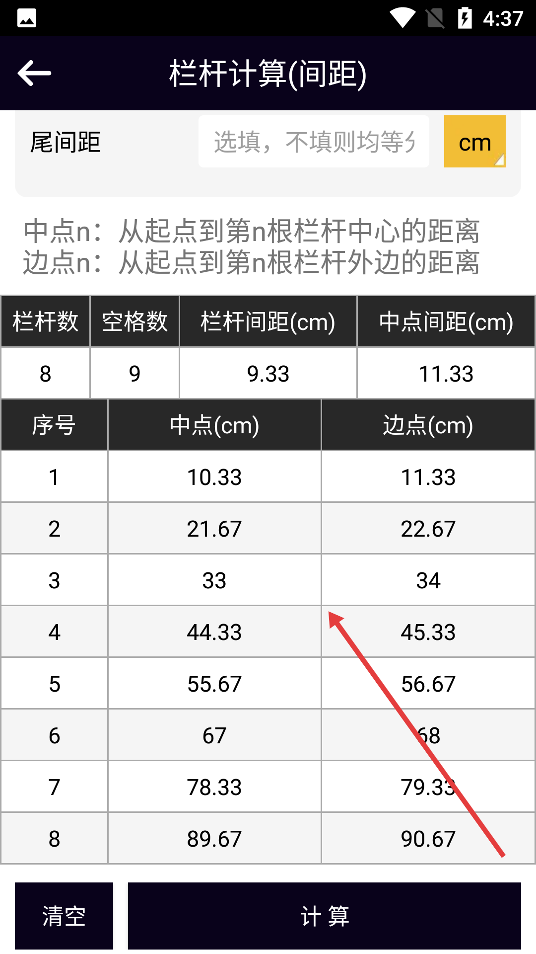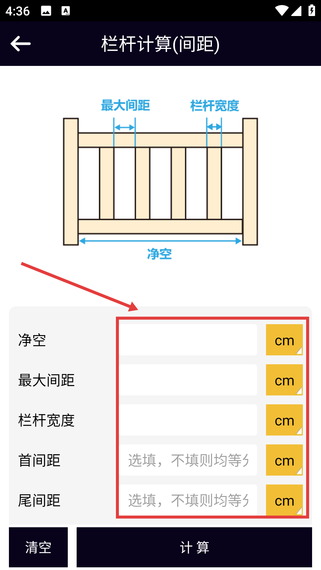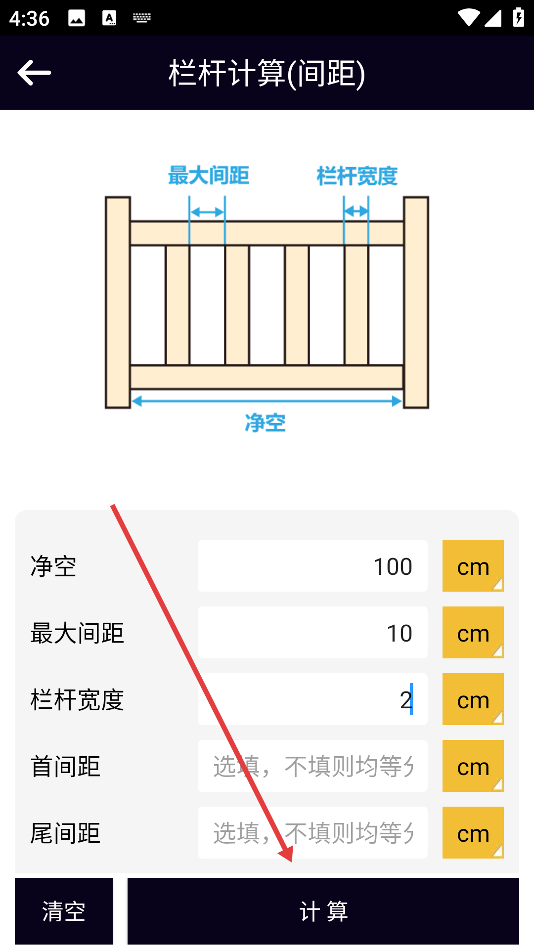 2、在欄桿間距計算頁面,輸入【凈空】【最大間距】【欄桿寬度】等參數(shù)(單位為cm)。