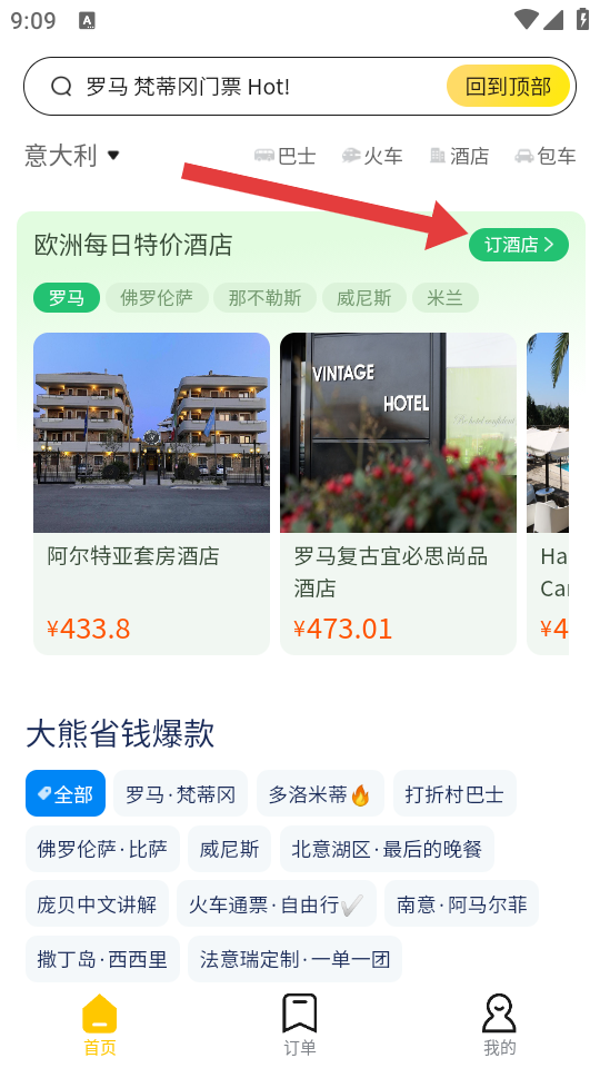 1、在大熊旅行APP首頁(yè)點(diǎn)擊【訂酒店】按鈕進(jìn)入酒店預(yù)訂頁(yè)面。