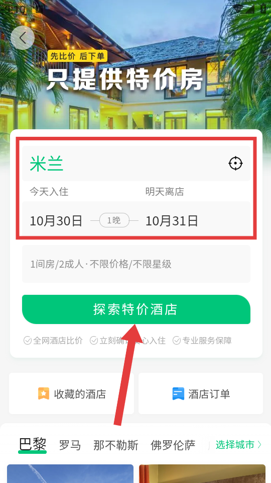 2、選擇城市為【米蘭】,設(shè)置入住離店時(shí)間后點(diǎn)擊【探索特價(jià)酒店】。