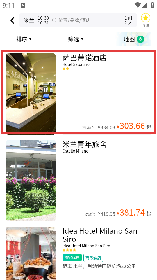 3、在酒店列表中選擇【薩巴蒂諾酒店】進(jìn)入詳情頁(yè)。