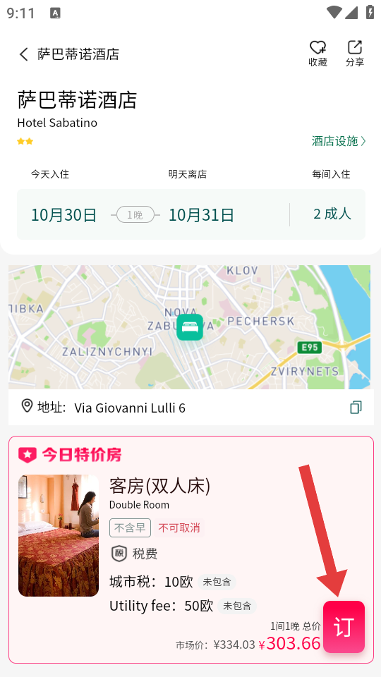 4、在酒店詳情頁(yè)點(diǎn)擊右下角紅色【訂】按鈕完成預(yù)訂流程。