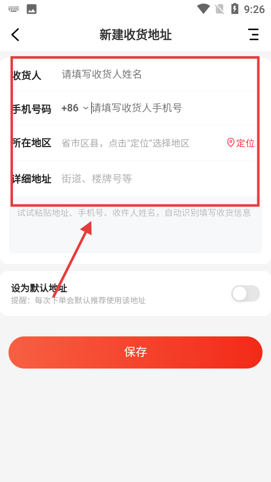 4、填寫(xiě)收貨人、手機(jī)號(hào)碼、所在地區(qū)、詳細(xì)地址等信息,完成收貨地址添加操作。