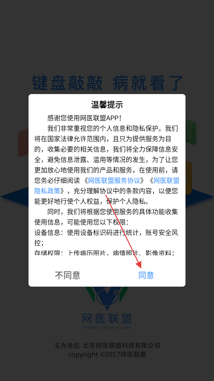 1、使用【網醫(yī)聯(lián)盟APP】前,需閱讀并同意【服務協(xié)議】與【隱私政策】,點擊【同意】方可進入登錄界面。