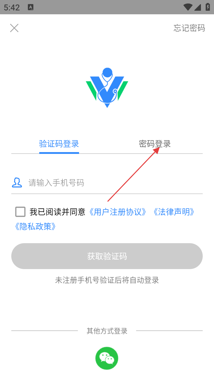2、進入登錄界面后,可選擇【驗證碼登錄】或【密碼登錄】,若選密碼登錄,需切換至對應選項欄。