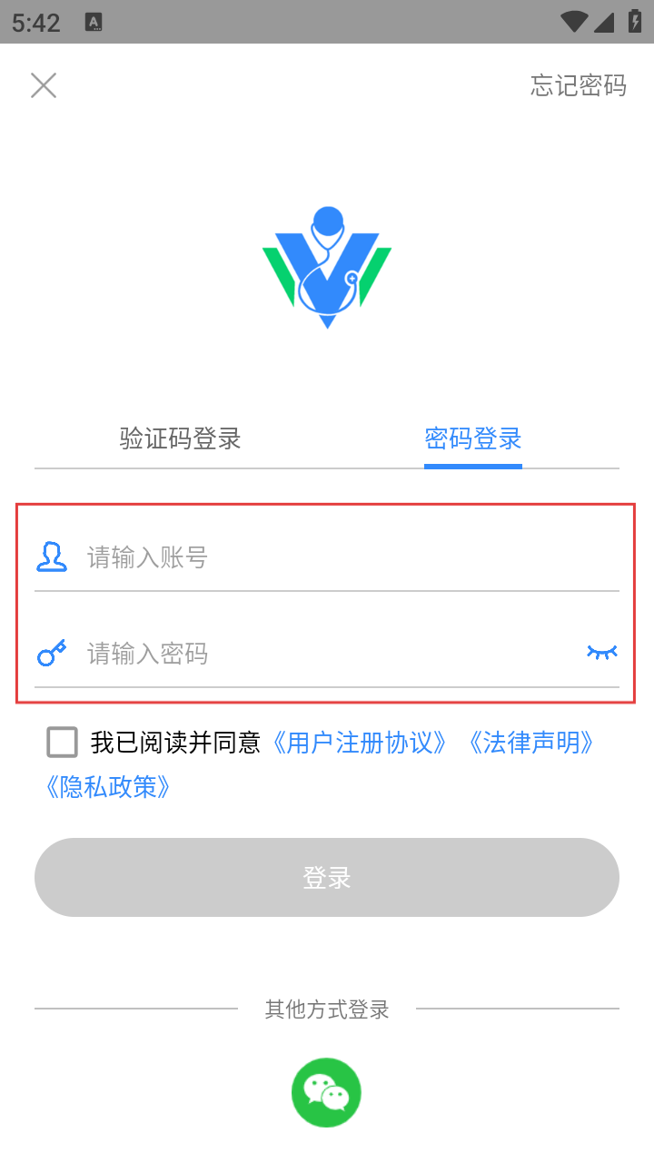 3、在密碼登錄界面,需在對應輸入框填寫賬號和密碼,注意密碼可通過睫毛圖標切換可見性。