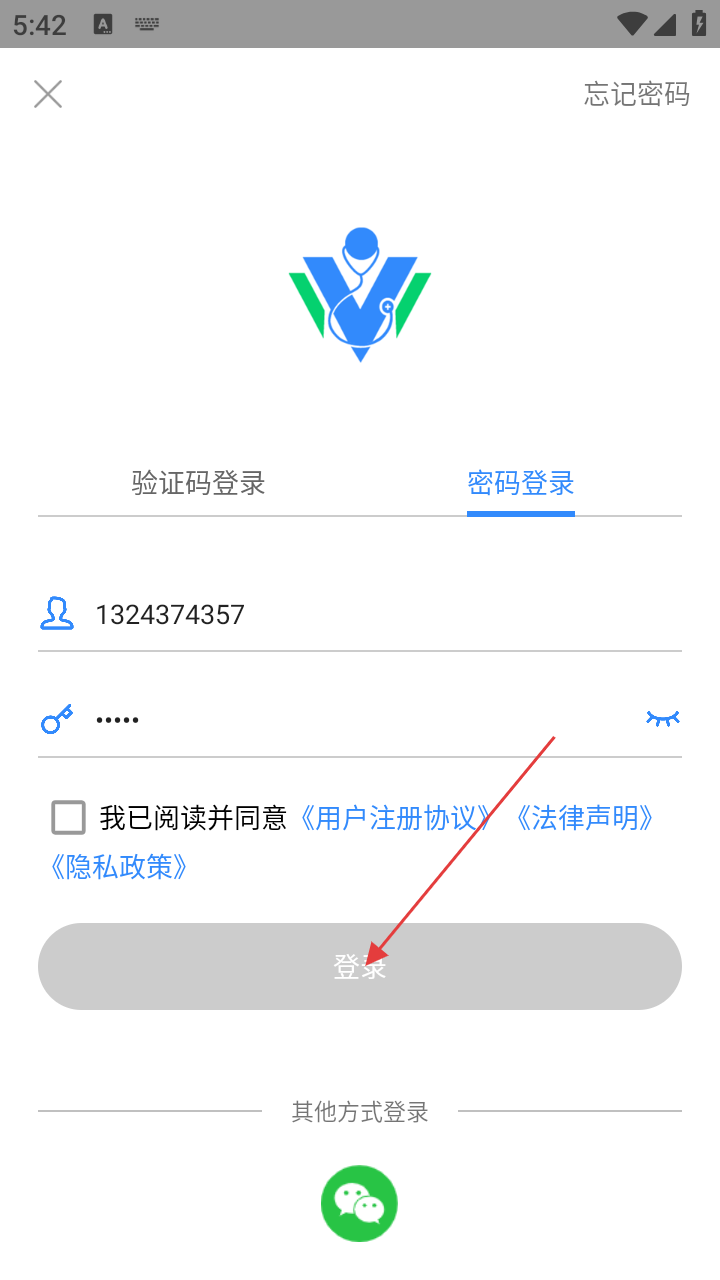 4、輸入賬號與密碼后,勾選同意協(xié)議,點擊【登錄】按鈕即可完成密碼登錄操作。