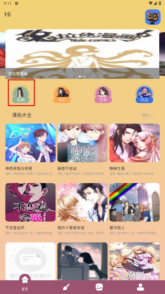 1、在首頁點(diǎn)擊【古風(fēng)-分類圖標(biāo)】,進(jìn)入古風(fēng)分類頁面。