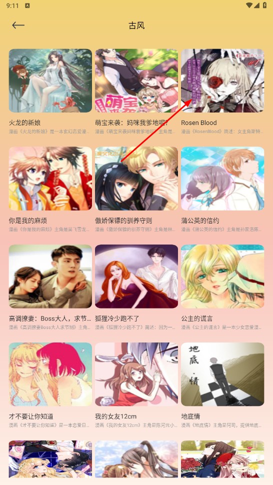 2、在古風(fēng)頁面,點(diǎn)擊【Rosen-Blood-漫畫封面】,查看漫畫詳情。
