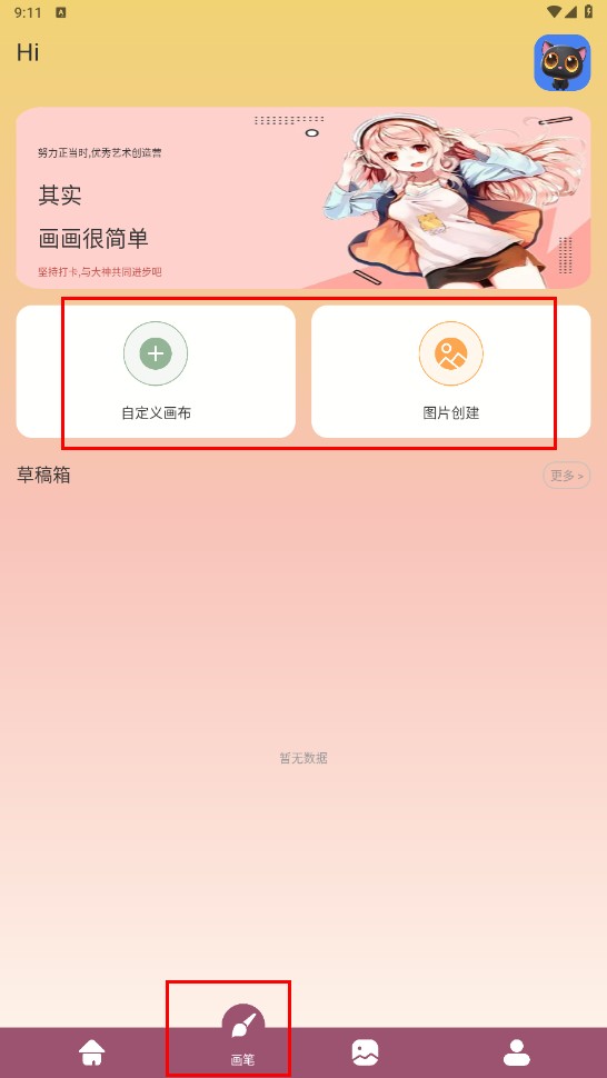 4、點(diǎn)擊底部【畫筆-功能按鈕】,進(jìn)入繪畫頁面,可選擇【自定義畫布】或【圖片創(chuàng)建】進(jìn)行創(chuàng)作。