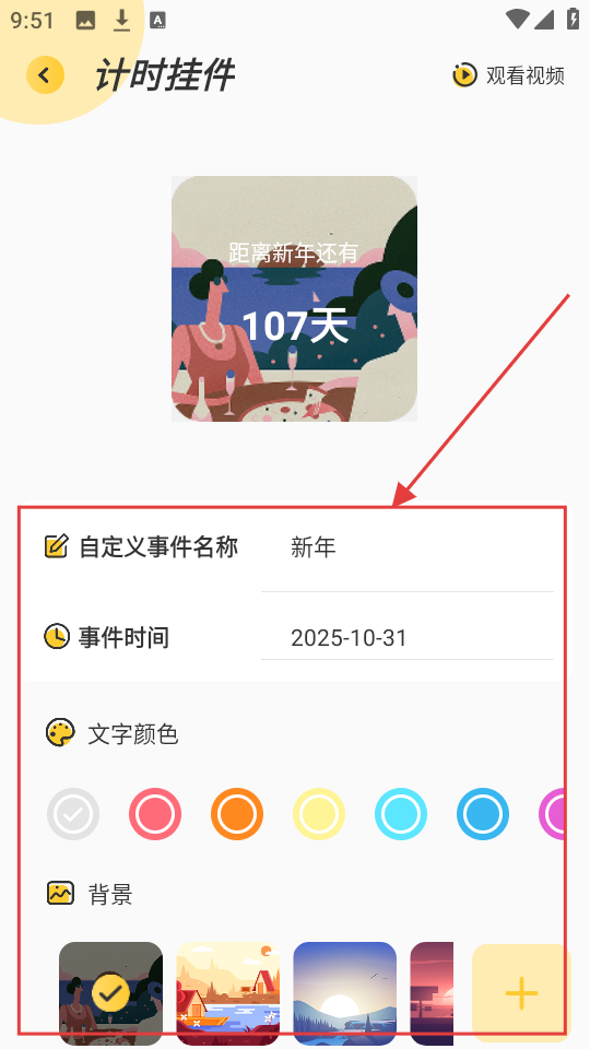 3、編輯計(jì)時(shí)掛件時(shí),可自定義事件名稱、時(shí)間,還能選文字顏色和背景,超個(gè)性化呢。