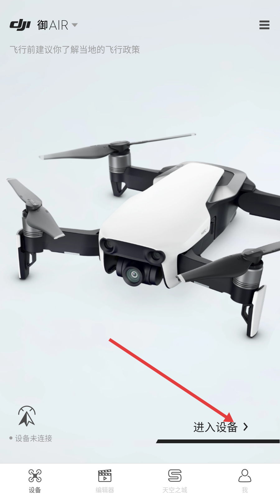 1、在大疆御AIR的APP界面,點(diǎn)擊【進(jìn)入設(shè)備】按鈕,進(jìn)入設(shè)備連接流程。