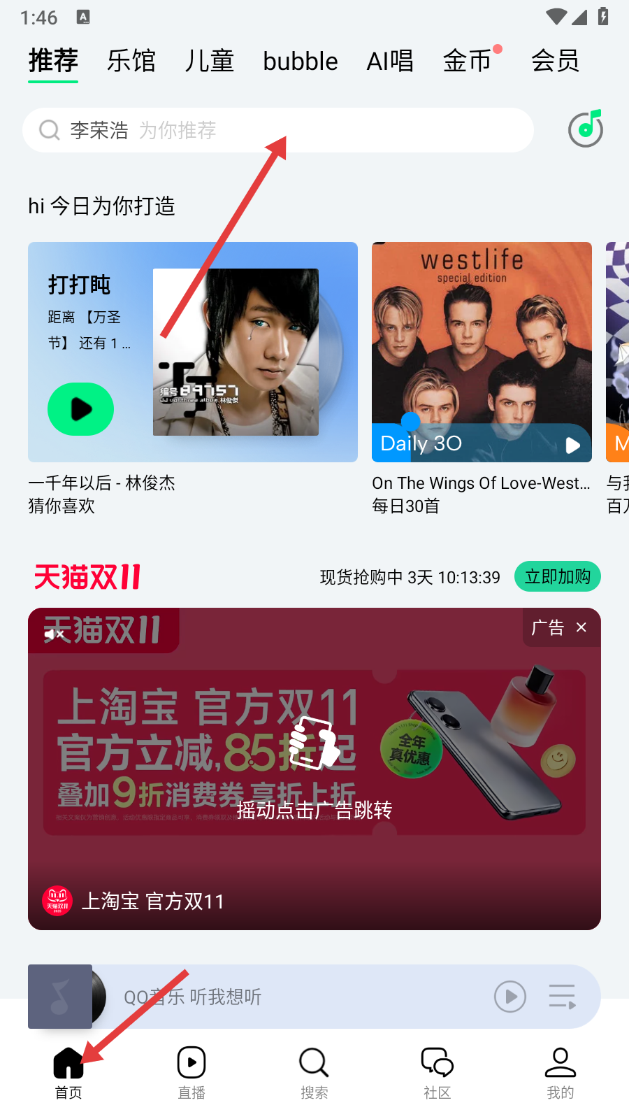 1、在【首頁】點擊頂部搜索欄,可進行音樂搜索。