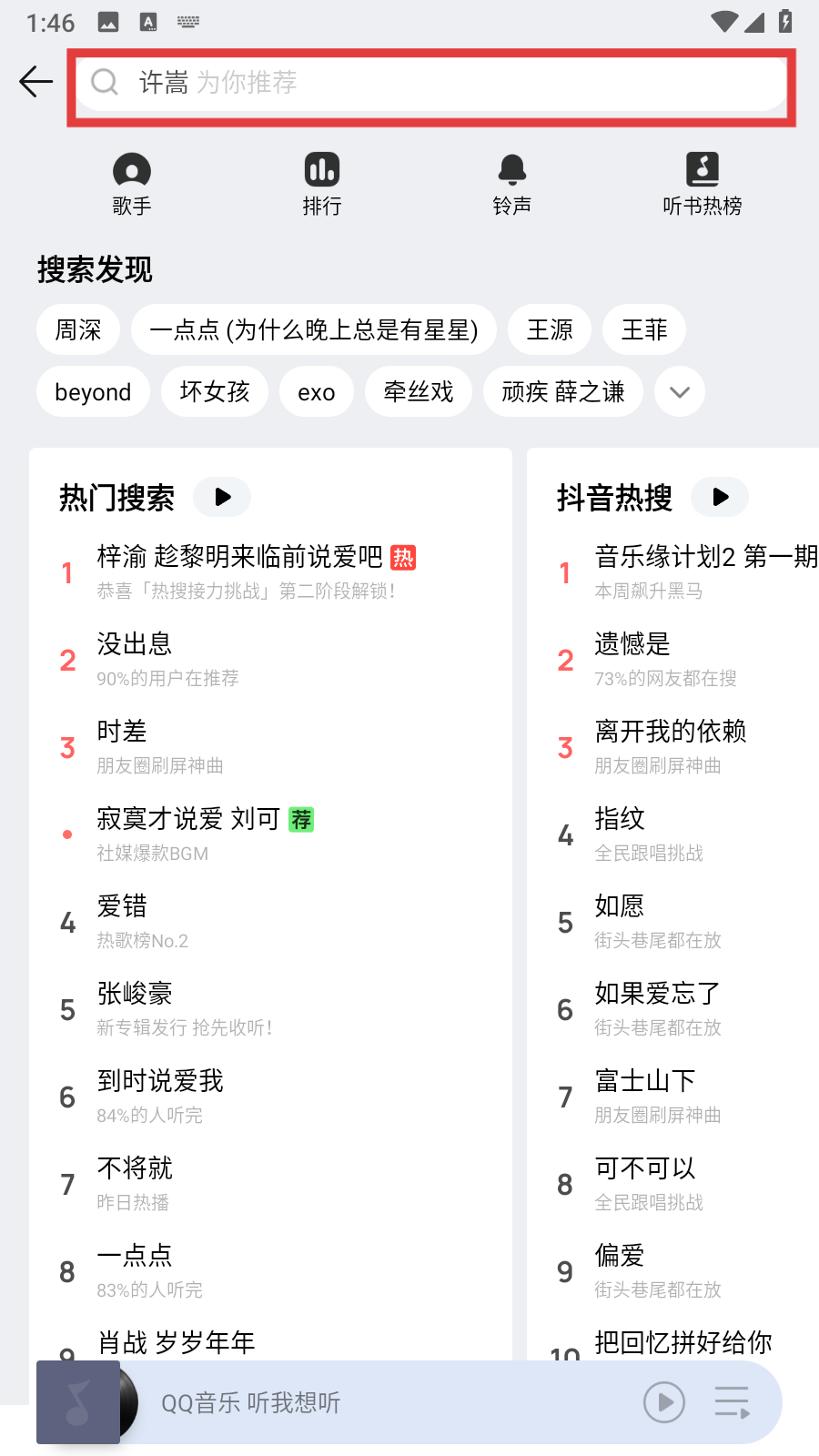 2、在搜索欄輸入“許嵩”,可查看相關(guān)歌手、排行等推薦內(nèi)容。
