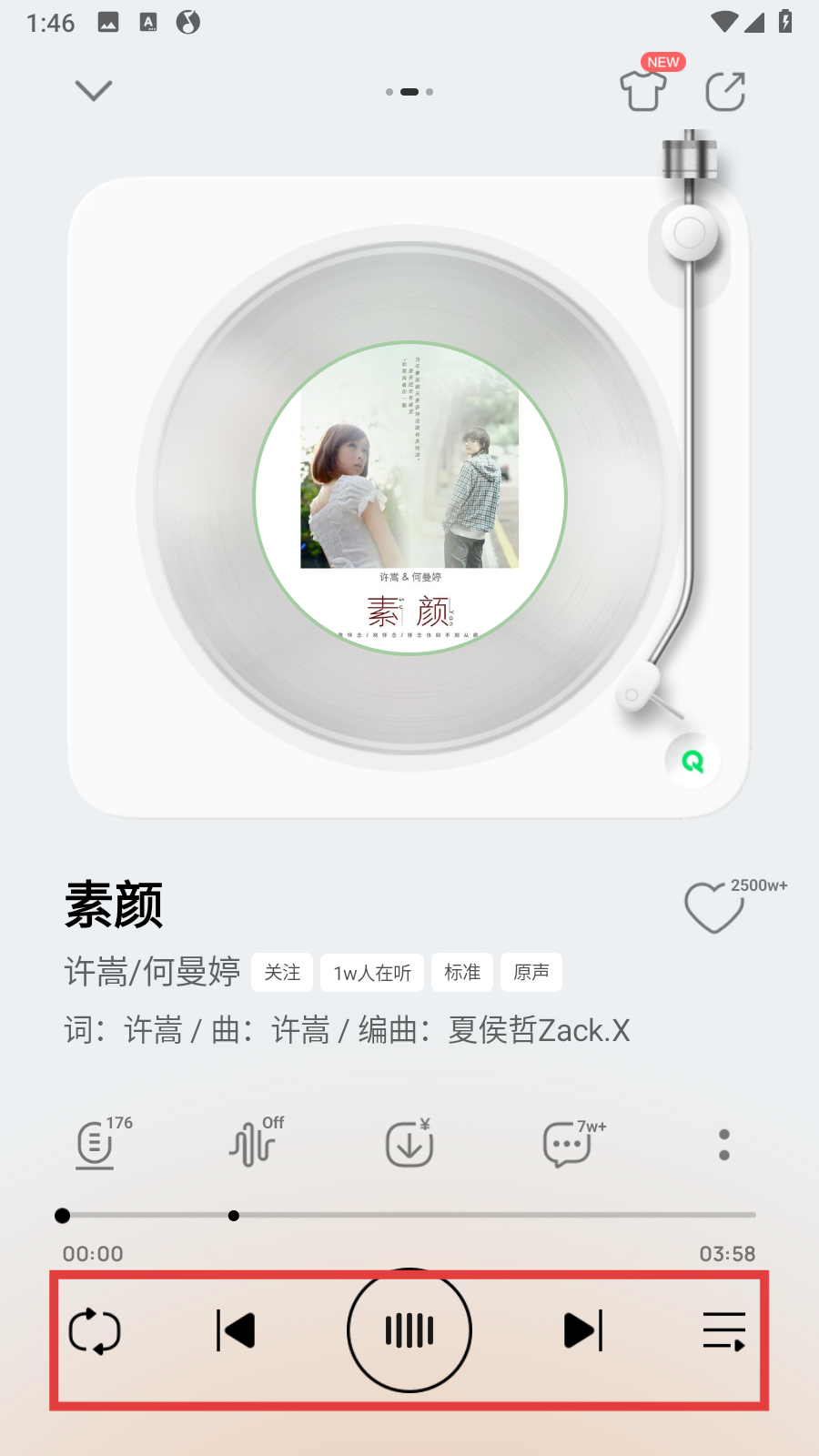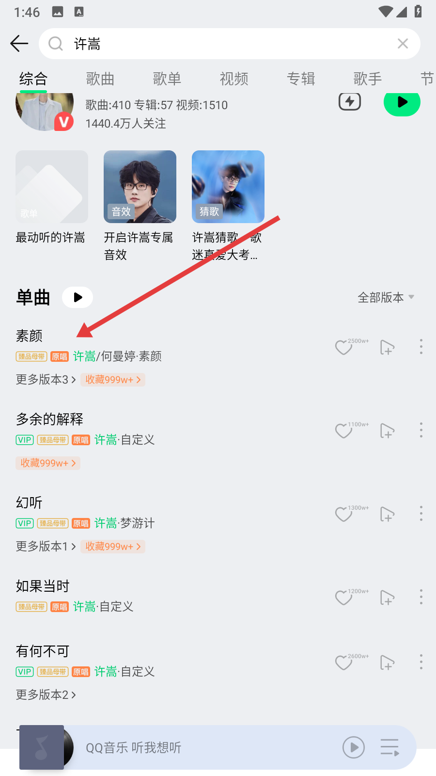 3、搜索“許嵩”后,在單曲列表中點擊《素顏》可進入播放頁面。
