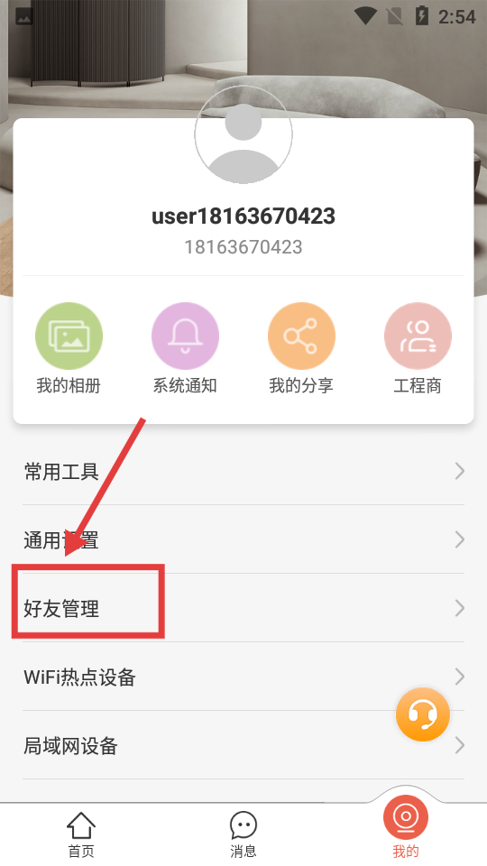 1、點擊底部【我的】,進入個人頁面,可查看我的相冊、系統(tǒng)通知等功能入口,也可進行好友管理操作。
