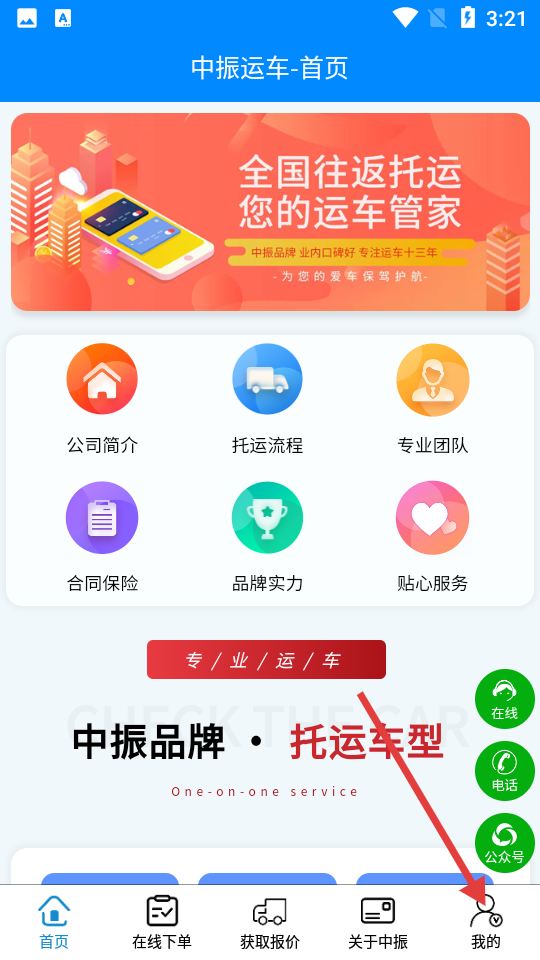 1、在服務協(xié)議和隱私政策彈窗中點擊【同意并接受】,進入中振運車主界面,可查看公司簡介、托運流程等運車服務功能。