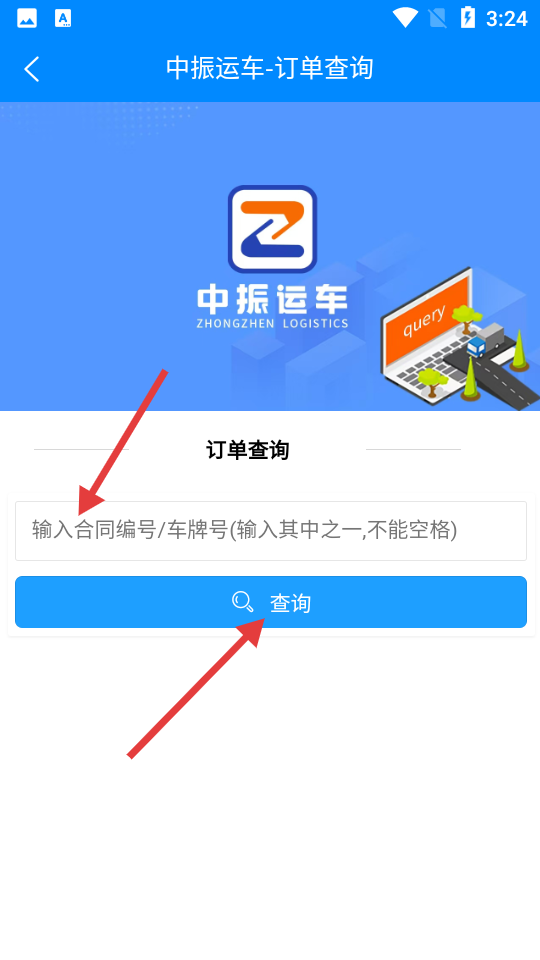 4、在查詢頁面輸入【合同編號】或【車牌號】,點擊【查詢】,完成運車訂單的查詢操作。