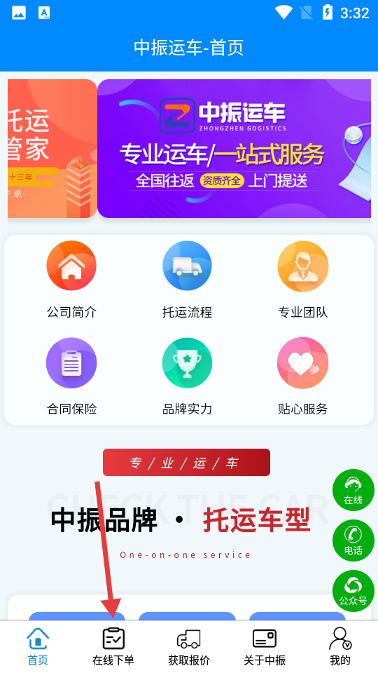 1、進(jìn)入中振運(yùn)車(chē)主界面后,點(diǎn)擊底部【在線下單】,進(jìn)入小板在線下單頁(yè)面。