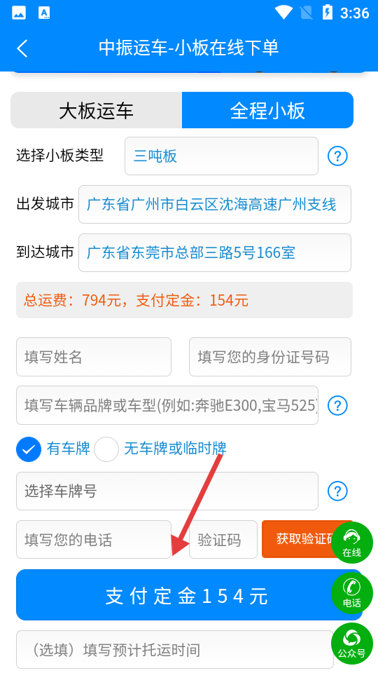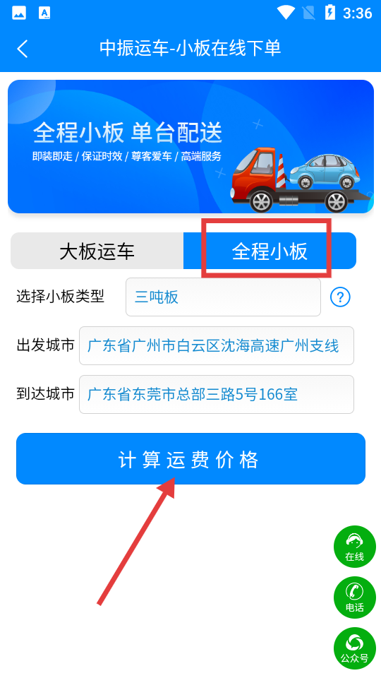 2、選擇運(yùn)輸類(lèi)型(如全程小板),設(shè)置出發(fā)城市、到達(dá)城市等信息,點(diǎn)擊【計(jì)算運(yùn)費(fèi)價(jià)格】。