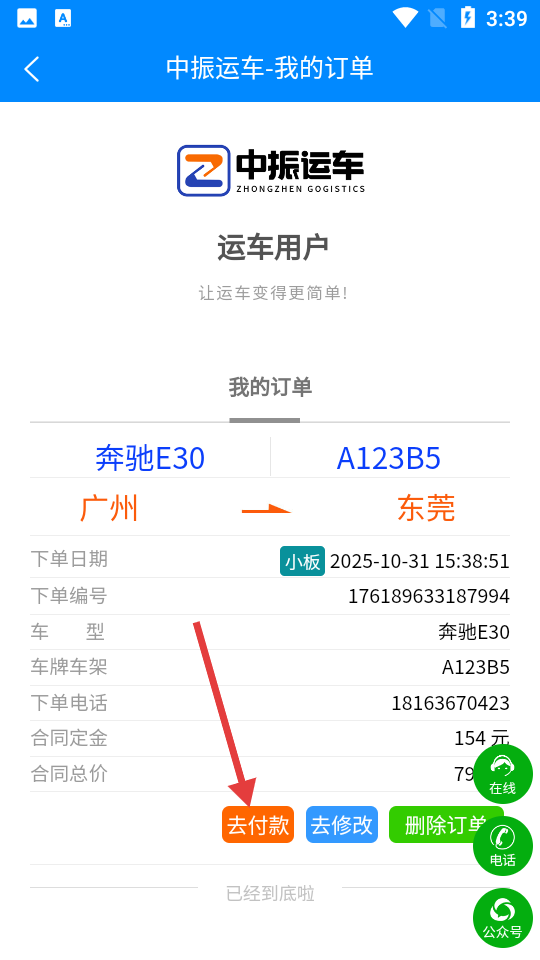 4、在我的訂單頁(yè)面可查看訂單詳情,點(diǎn)擊【去付款】完成支付,完成在線下單流程,適用于車(chē)輛托運(yùn)的在線預(yù)約與支付場(chǎng)景。