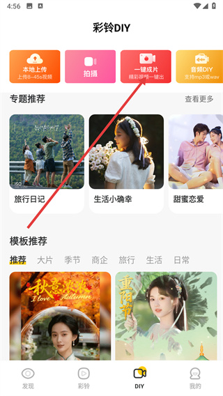 1、進入彩鈴DIY頁面,選擇【一鍵成片】,快速制作精彩視頻彩鈴。