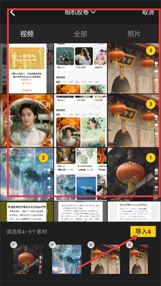 2、在素材選擇界面,從相冊中選4-9個素材,點擊【導(dǎo)入】,為視頻彩鈴合成準備素材。
