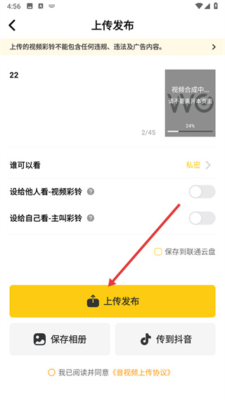 4、在上傳發(fā)布頁面,設(shè)置可見范圍并勾選協(xié)議后,點擊【上傳發(fā)布】,完成專屬視頻彩鈴的創(chuàng)作與發(fā)布。